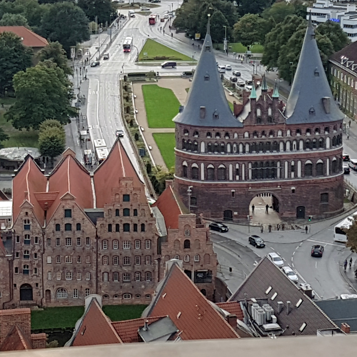 Mit 2 Türmen ragt imposant St. Marien heraus, die Kirche der reichen Kaufleute, z.B. aus der Mengstraße direkt nebenan, wo sich auch das Thomas Mann Haus befindet.